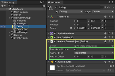 (5) 在 WallGameGroup、WallLeft、WallRight、Ceiling、DeathLine 物件中加入 Anchor Game Object (Script) 程式元件,並勾選「Execute In Update」以在 Unity 設計工具中「所見即得」,即時看到調整參數後的變化.然後,調整個物件中 Anchor Game Object (Script) 元件內的 Anchor Type 與 Anchor Offset 參數,以符合並固定在 Camera 範圍中.
